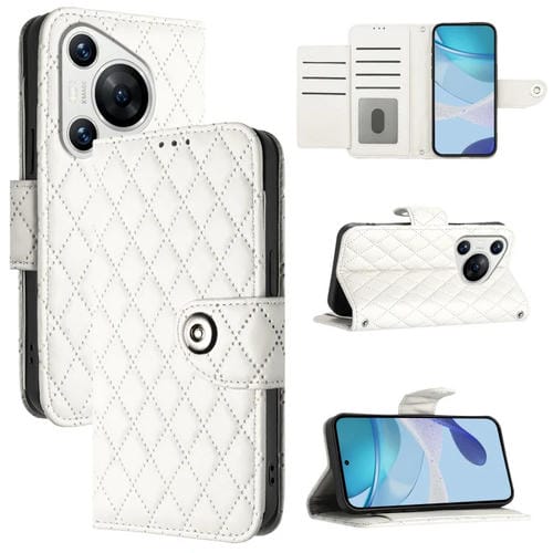 Funda de Cuero para Huawei Pura 70 con Tapa, Textura Rómbica y Cordón (Blanco)