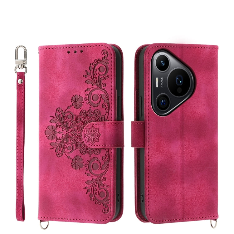Funda de Cuero para Huawei Pura 70 Pro y Pura 70 Pro+ con Billetera y Flores en Relieve (Rojo Vino)