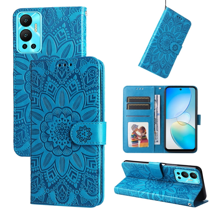 Estuche para Teléfono Infinix Hot 12 Cuero con Estampado de Girasol en Relieve (Azul)