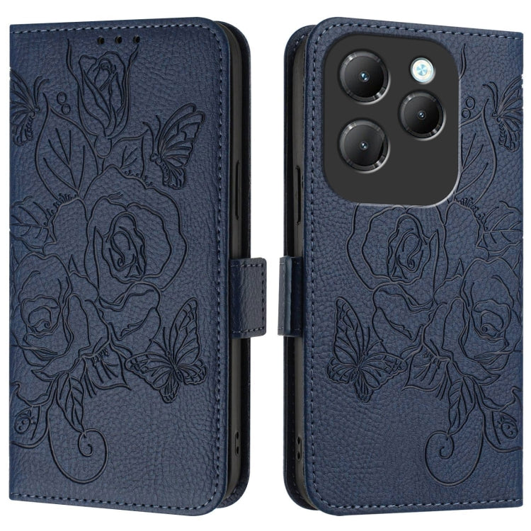 Estuche de Cuero Antirrobo para Infinix Hot 40/40 Pro con Rfid y Rose en Relieve (Azul Oscuro)