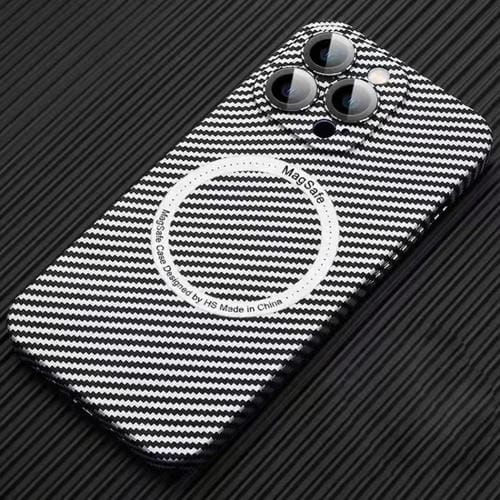 Estuche Magnético para Teléfono iPhone 11 Pro Max Magsafe Fibra de Carbono con Película para Lentes (Blanco Plateado)