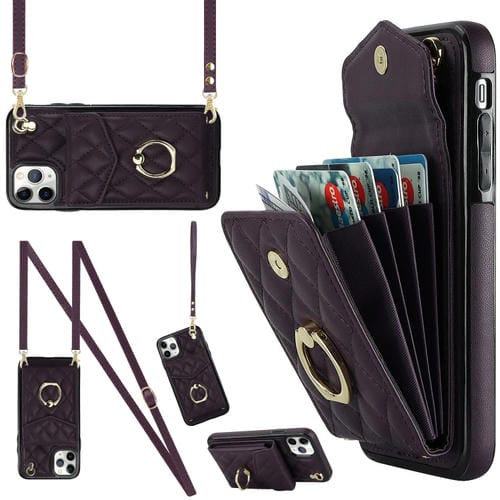 Funda para teléfono iPhone 11 Pro Rhombic Texture Card Bag con Cordón Largo (Púrpura Oscuro)
