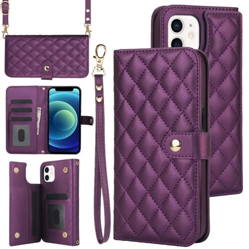 Funda para Teléfono iPhone 12/12 Pro Crossbody Cuero Rómbico Multifunción (Púrpura Oscuro)