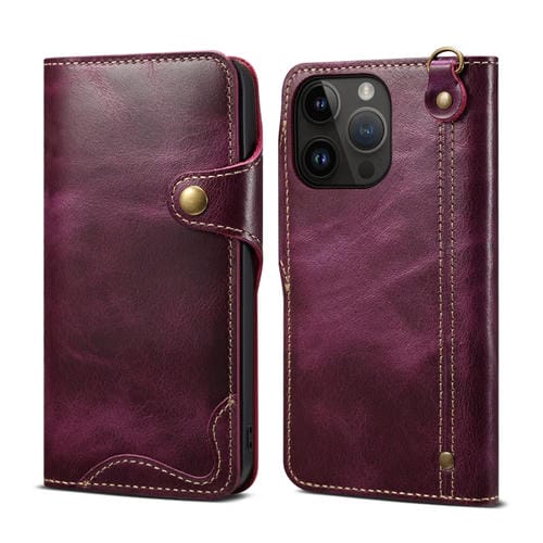 Funda para iPhone 12/12 Pro Denior Oil Wax Cuero de Vaca Botón Magnético (Púrpura)