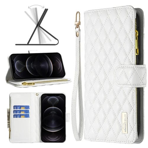 Funda de Cuero para iPhone 12/12 Pro Diamond Lattice Zipper Wallet con Tapa (Blanco)