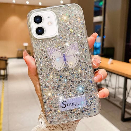 Funda para Teléfono TPU Epoxi iPhone 12 con Lentejuelas Estrelladas y Diamantes de Imitación Mariposa (Plateado)