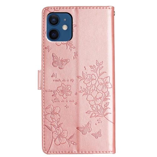 Funda para Teléfono iPhone 12 Mini Cuero Relieve Flor de Amor y Mariposa (Oro Rosa)