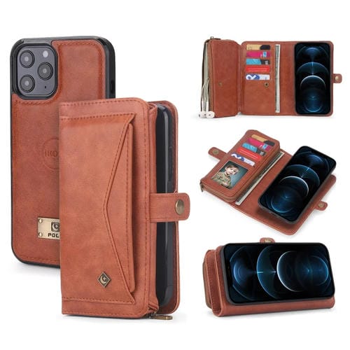 Funda para Teléfono iPhone 12 Pro Cuero con Billetera y Cremallera Multifuncional (Marrón)