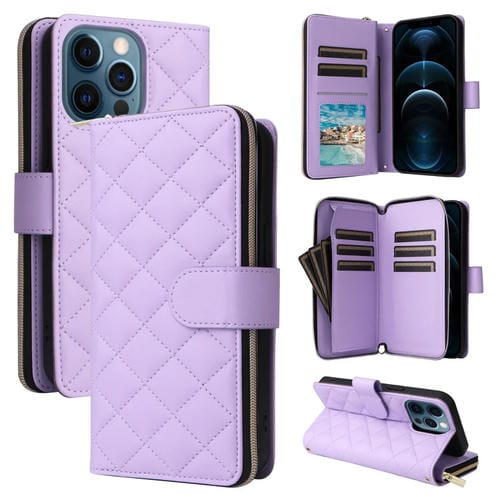 Pour iPhone 12 Pro Max Crossbody Rhombic Zipper Tower Buckle Étui de téléphone en cuir avec lanière (violet)
