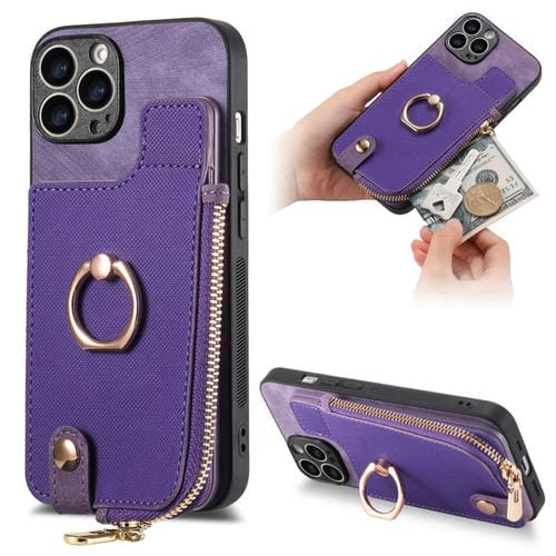 Estuche para Teléfono iPhone 12 Pro Max con Billetera, Cremallera Vertical y Anillo de Cuero Cruzado (Púrpura)