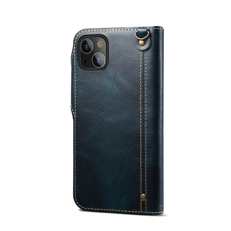 Funda para iPhone 13 Mini Denior Oil Wax Cowhide Botón Magnético de Cuero Genuino (Azul Oscuro)