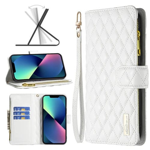Funda para iPhone 13 Mini Diamond Lattice Zipper Wallet de Cuero con Tapa (Blanco)