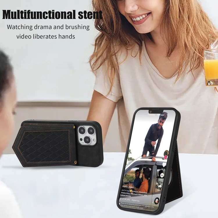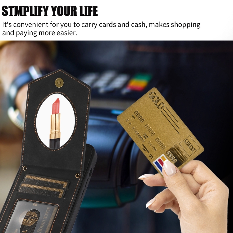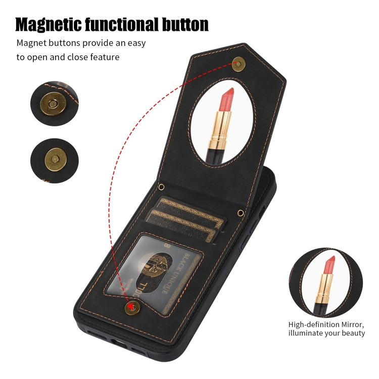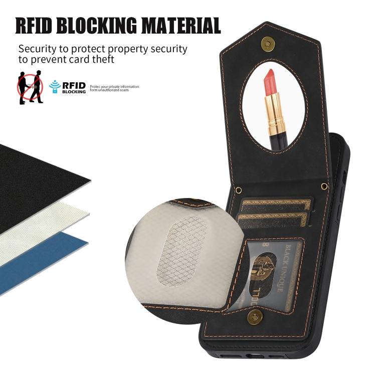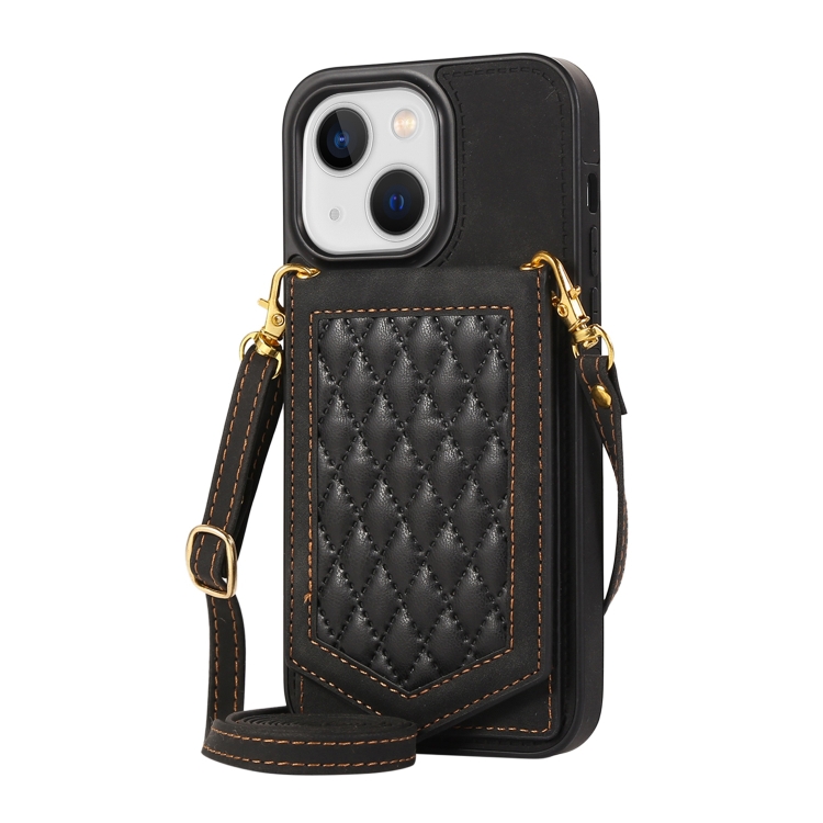 Funda para iPhone 13 Mini Rhombic Texture Rfid con Cordón y Espejo (Negro)