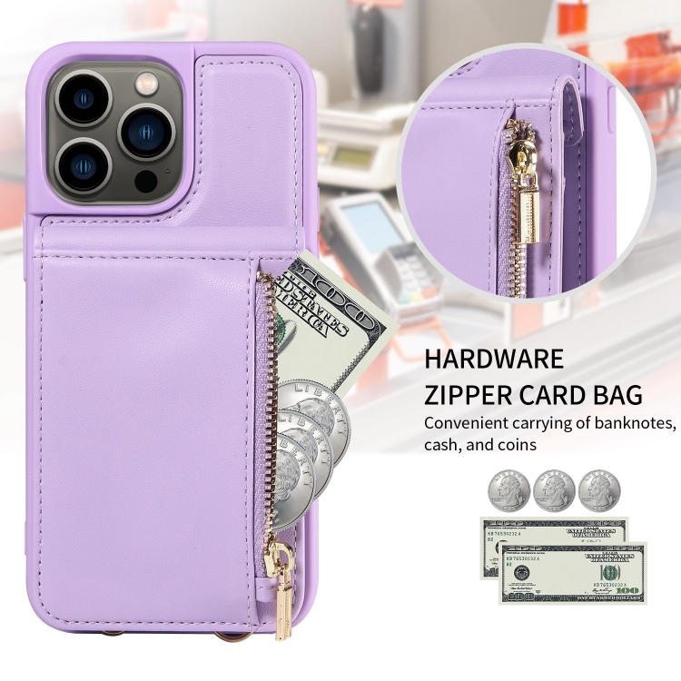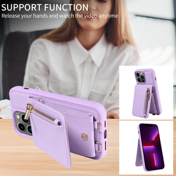 Funda de Cuero para Teléfono iPhone 13 Pro Crossbody Lanyard Zipper Wallet (Púrpura)