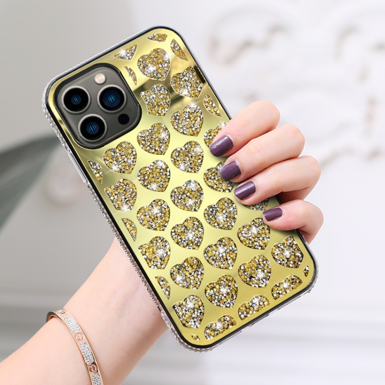 Funda para iPhone 13 Pro Love Hearts Diamond Mirror TPU Phone Case (Oro)