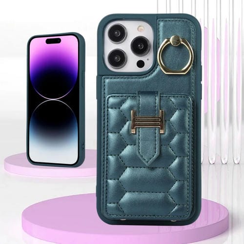 Funda para iPhone 13 Pro Max Vertical Card Bag Ring Holder con Doble Cordón (Verde Oscuro)