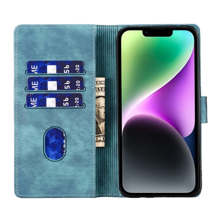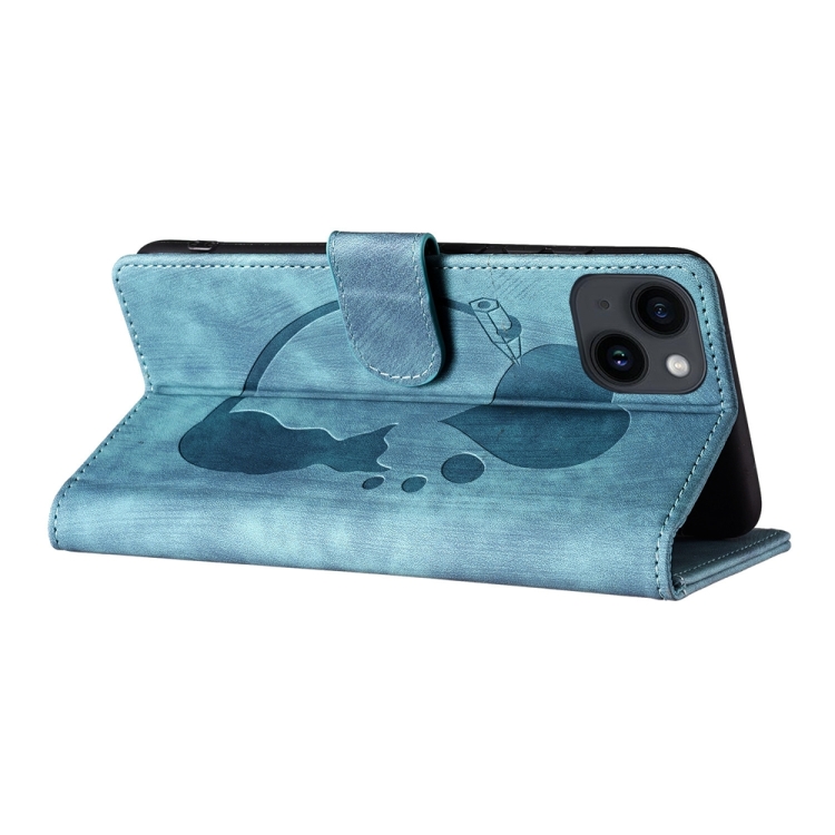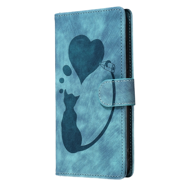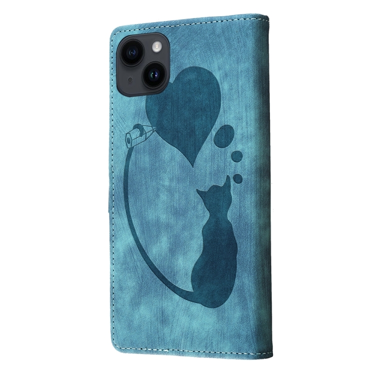 Estuche para Teléfono iPhone 14 Cuero Relieve Gato y Corazón (Azul)