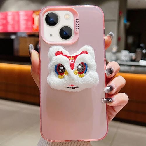 Funda para Teléfono iPhone 14 Muñeco de Peluche y Danza del León Blanco con Espalda Rosa