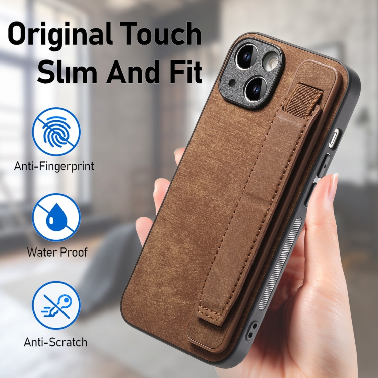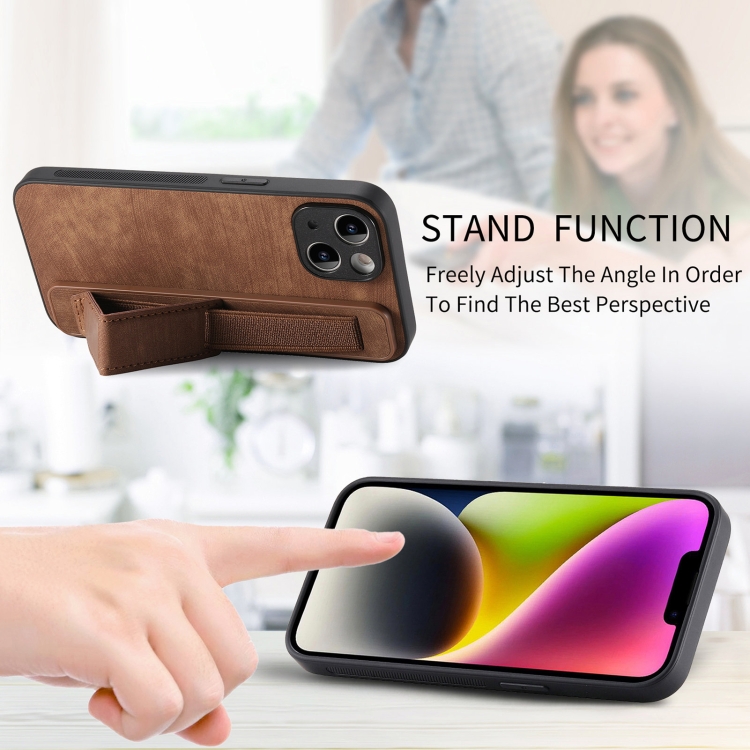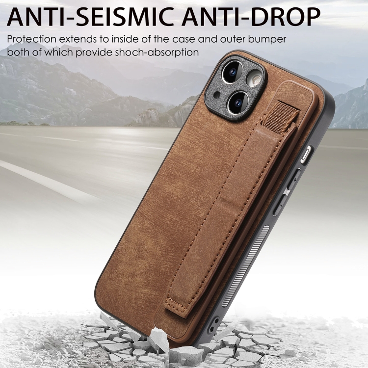 Funda Trasera de Cuero para iPhone 14 con Soporte para Pulsera Retro (Marrón)
