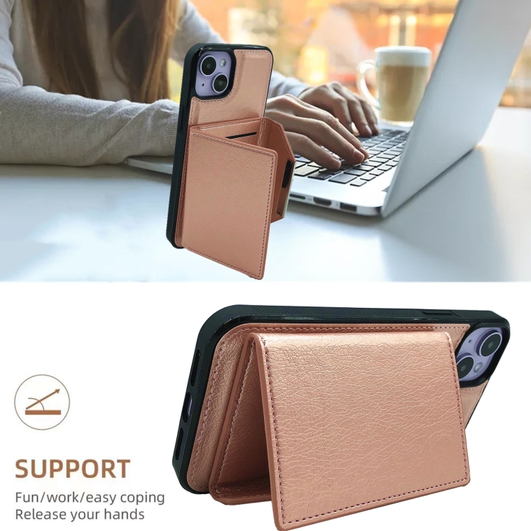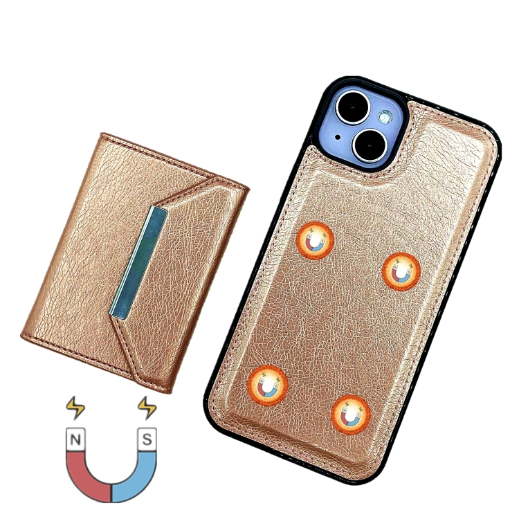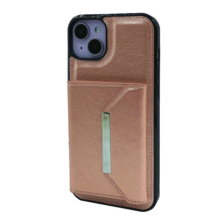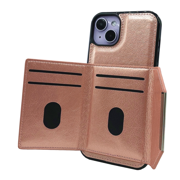 Funda para Teléfono iPhone 14 Plus con Bolsa y Ranuras para Tarjetas con Hebilla de Metal (Oro Rosa)