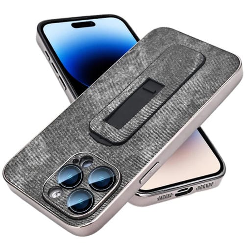 Estuche para teléfono iPhone 14 Pro con enfriamiento y soporte push-pull galvanizado con patrón de mezclilla (Negro)