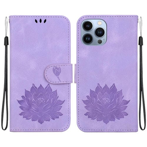 Funda para iPhone 14 Pro Cuero con Relieve de Loto (Púrpura)