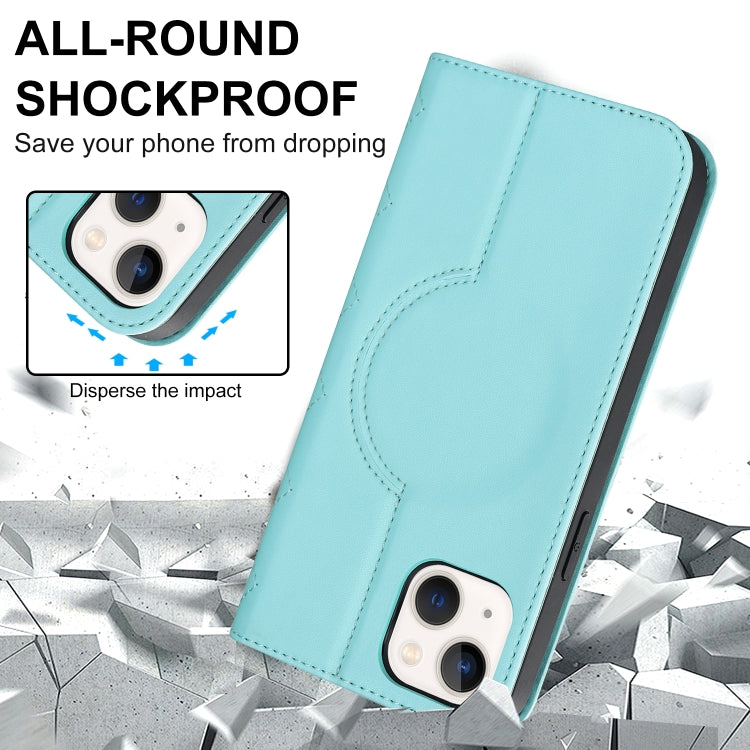 Funda para iPhone 14 Rhombic Magsafe Rfid Antirrobo de Cuero (Azul Cielo)
