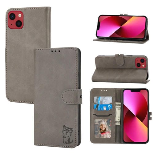 Funda de Cuero para Teléfono iPhone 15 Happy Cat Pattern Flip en Relieve (Gris)