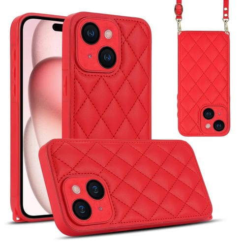 Estuche para Teléfono iPhone 15 con Textura Rómbica y Cordón Doble (Rojo)
