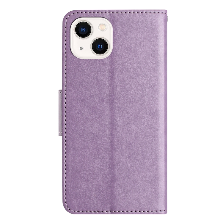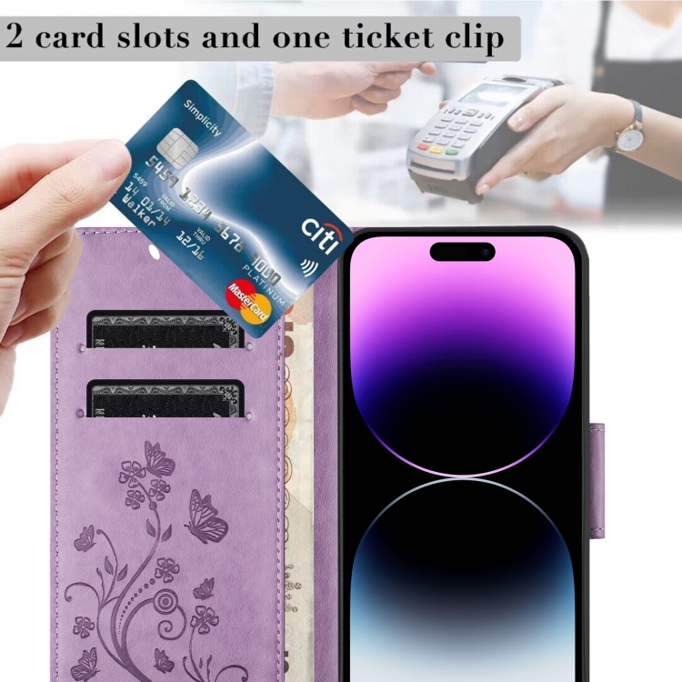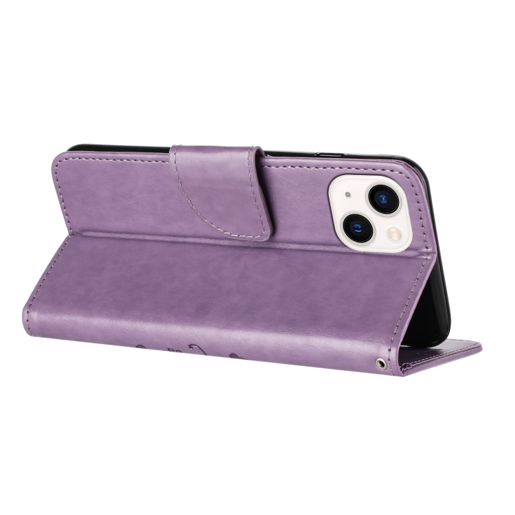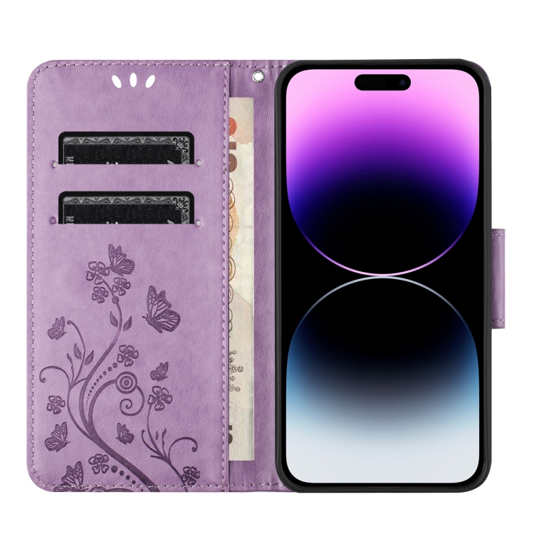 Funda de Cuero para iPhone 15 con Tapa y Patrón de Flores de Mariposa (Púrpura Claro)