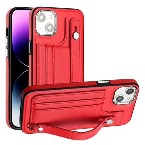 Pour iPhone 15 Étui de téléphone en cuir antichoc avec dragonne (rouge)