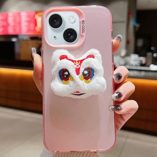 Funda para Teléfono iPhone 15 Muñeco de Peluche Danza del León Año Nuevo (León Blanco con Espalda Rosa)