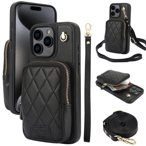 Funda para iPhone 15 Pro Awquer Crossbody Zipper Wallet Bag Cuero de Lichi (Negro)