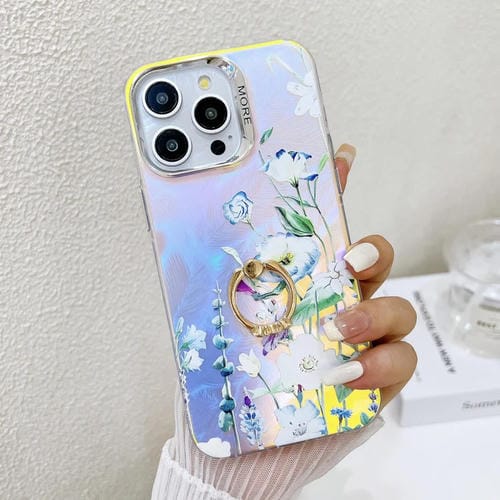 Caja de Teléfono TPU para iPhone 15 Pro con Soporte de Anillo Flor Láser Galvanoplastia (Azul)