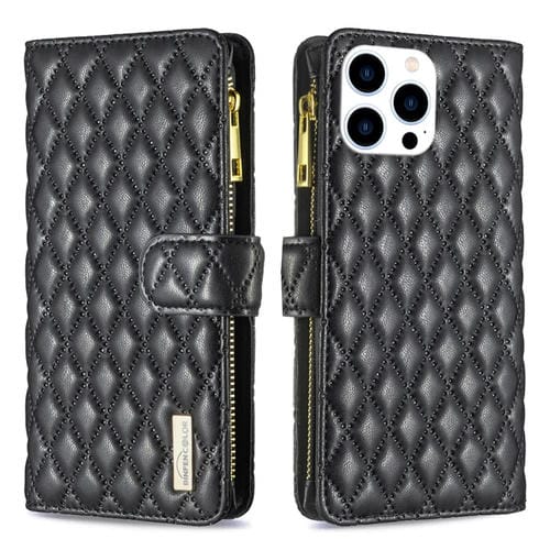 Funda para teléfono iPhone 15 Pro Diamond Lattice Zipper Wallet de cuero con tapa (Negro)