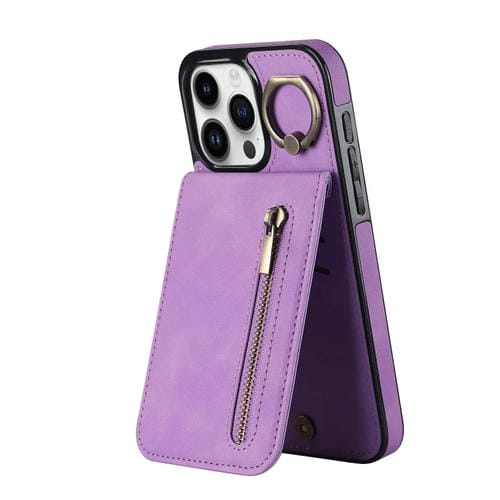 Estuche para Teléfono iPhone 15 Pro con Ranura para Tarjeta Rfid, Anillo Retro y Cremallera (Púrpura)