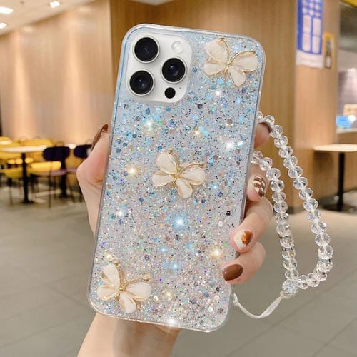 Funda para Teléfono iPhone 15 Pro TPU Epoxi Mariposa de Jade Lentejuelas Estrelladas con Correa (Plateada)