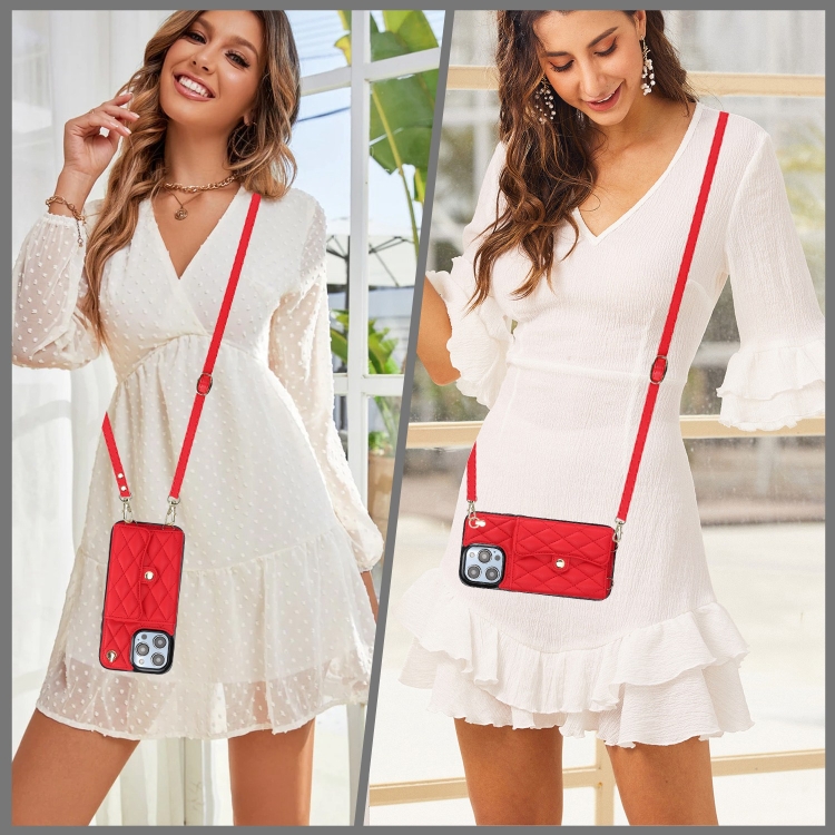 Pour iPhone 15 Pro Max Étui de téléphone en cuir à portefeuille horizontal rhombique à bandoulière (rouge)