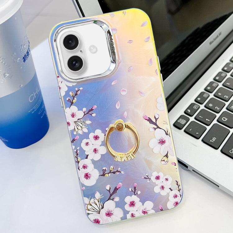 Caja de teléfono TPU para iPhone 16 con soporte de anillo y flor láser galvanoplastia (Flor de Ciruelo Ah18)