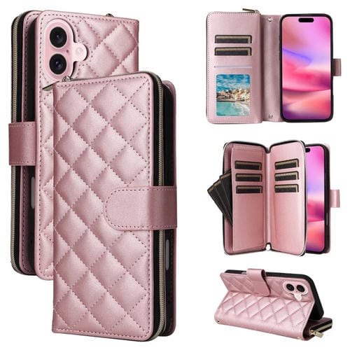 Funda para Teléfono iPhone 16 Cuero Hebilla Torre Cremallera Rómbica Cruzada Cordón (Oro Rosa)