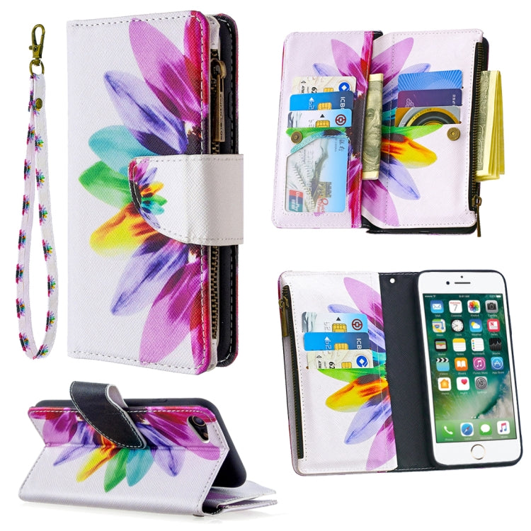Funda de cuero iPhone 8 y 7 patrón dibujo colores cremallera tapa horizontal soporte ranuras tarjetas billetera (Sun Flower)