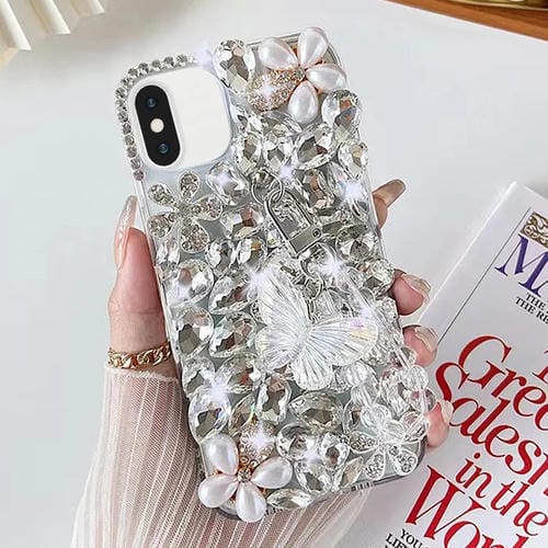 Funda para Teléfono iPhone X Xs Incrustaciones Diamantes Mariposas Hecha a Mano (Blanco)
