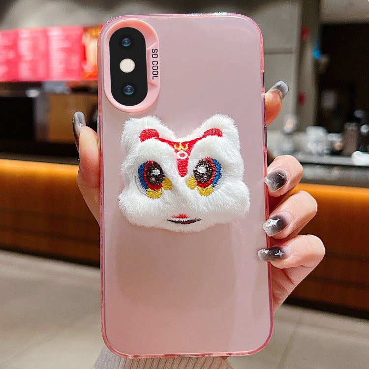Funda para Teléfono iPhone X / Xs con Muñeco de Peluche y Danza del León de Año Nuevo (León Blanco con Espalda Rosa)