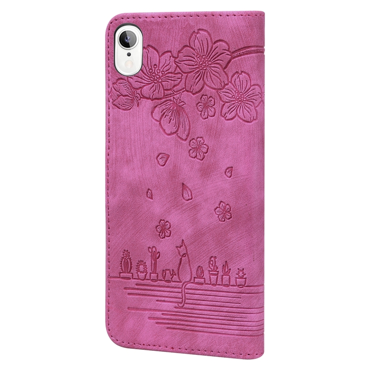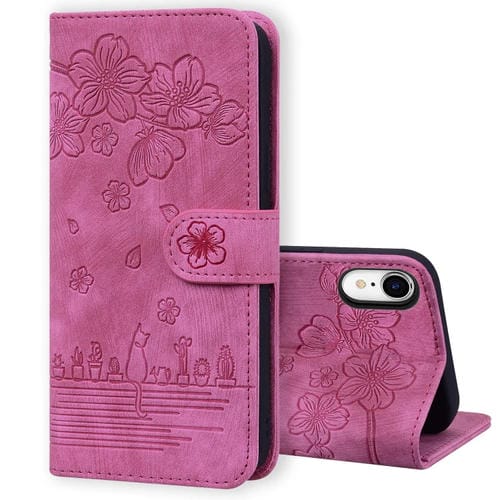 Estuche para iPhone Xr Cartoon Sakura Cat de Cuero en Relieve (Rose Red)