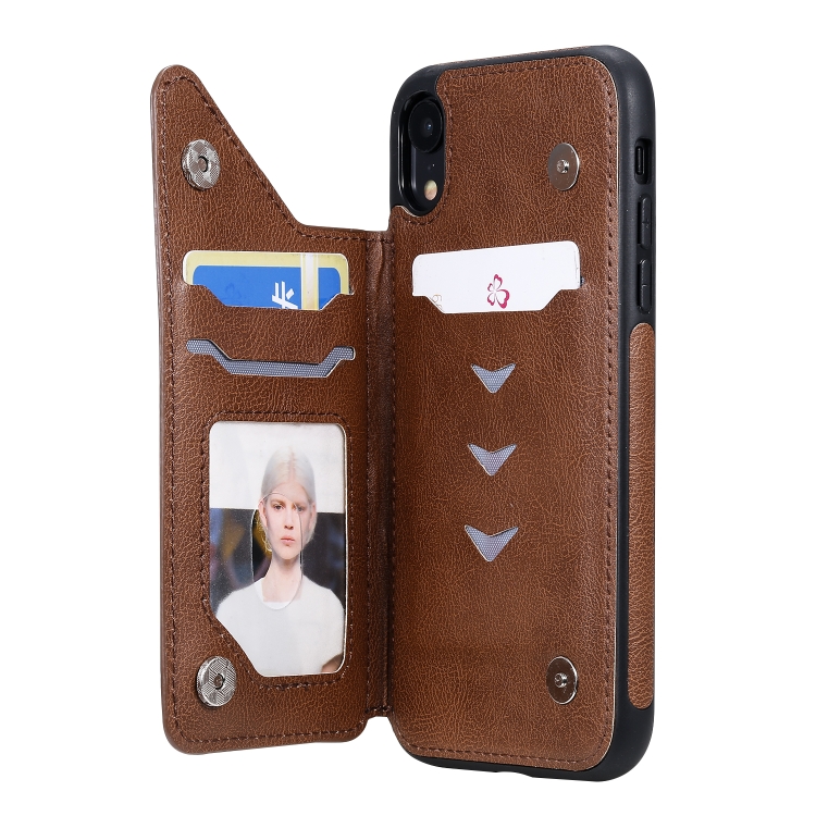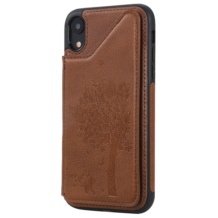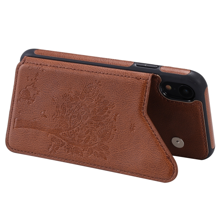 Estuche protector para iPhone Xr Cat Tree con patrón embossing, ranuras para tarjetas, marco de fotos y soporte (Marrón)