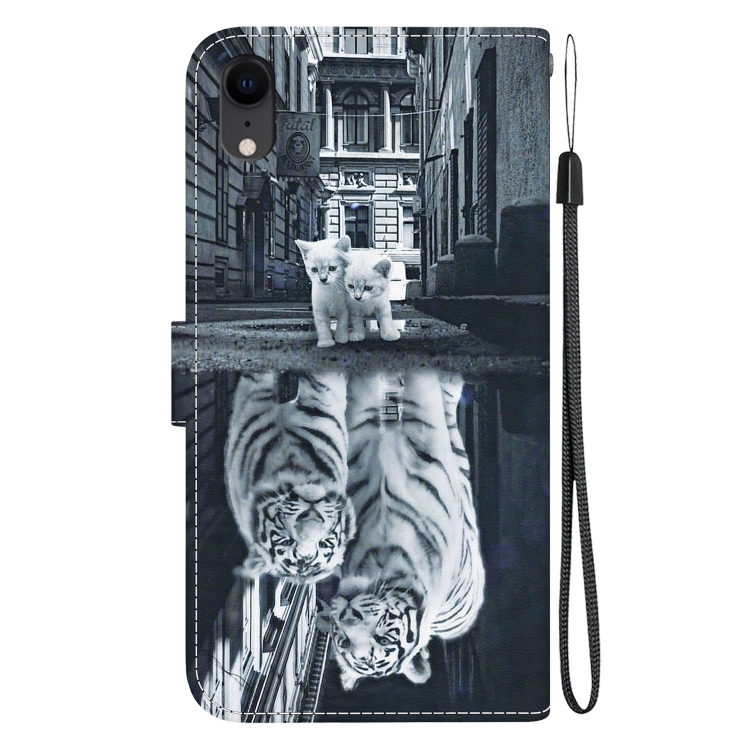 Estuche de Cuero para iPhone Xr con Dibujo Coloreado y Textura de Cristal (Reflejo de Tigre Gato)