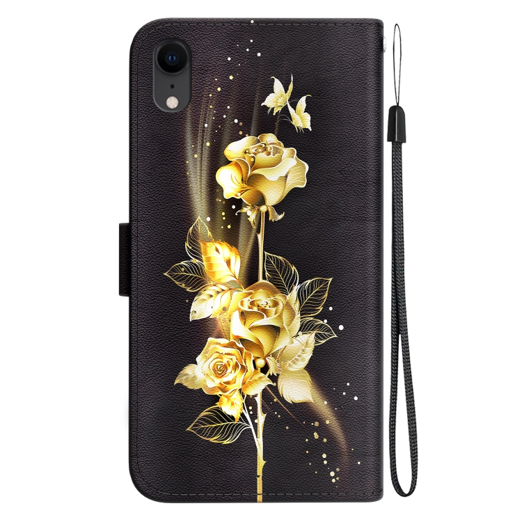 Funda de Cuero para iPhone Xr con Dibujo Coloreado y Textura de Cristal (Mariposa Dorada y Rosa)