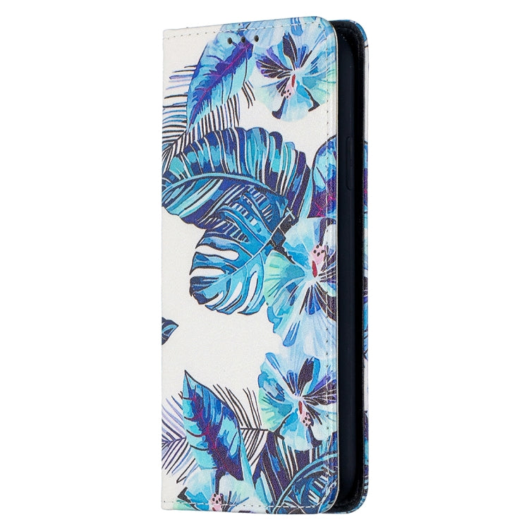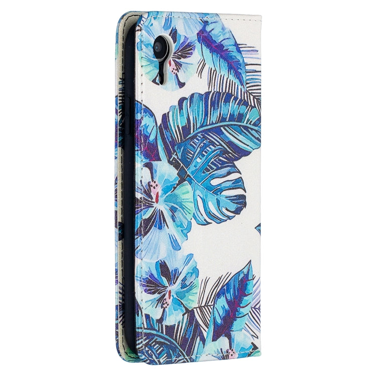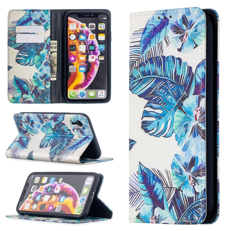 Funda de Cuero de PU para iPhone Xr con Patrón de Dibujo Coloreado, Tapa Horizontal Magnética Invisible, Soporte y Ranuras para Tarjetas (Hojas Azules)