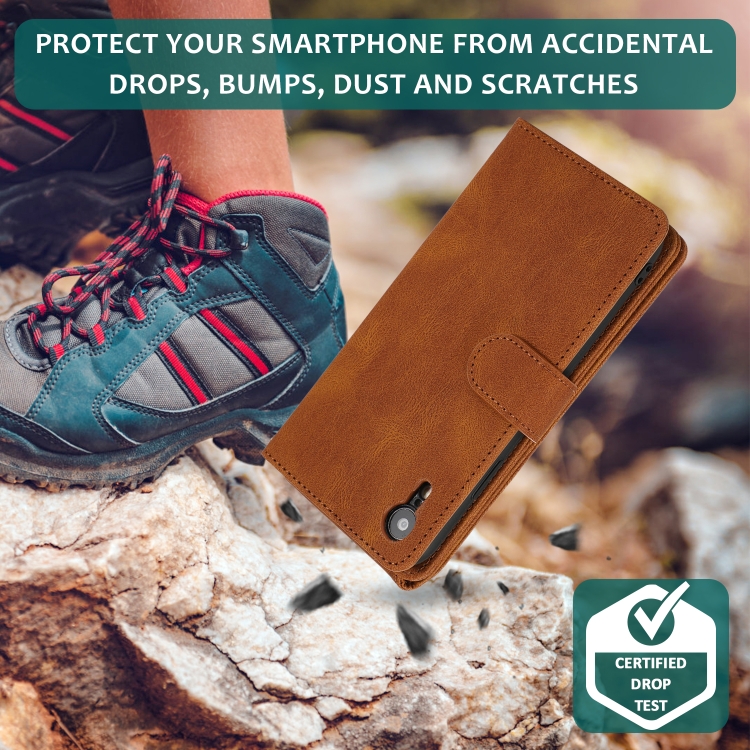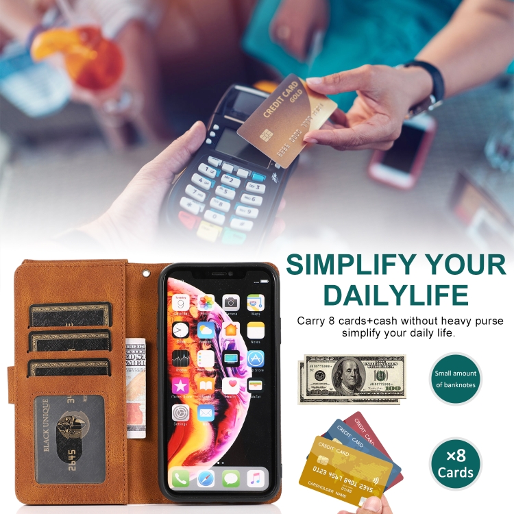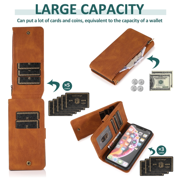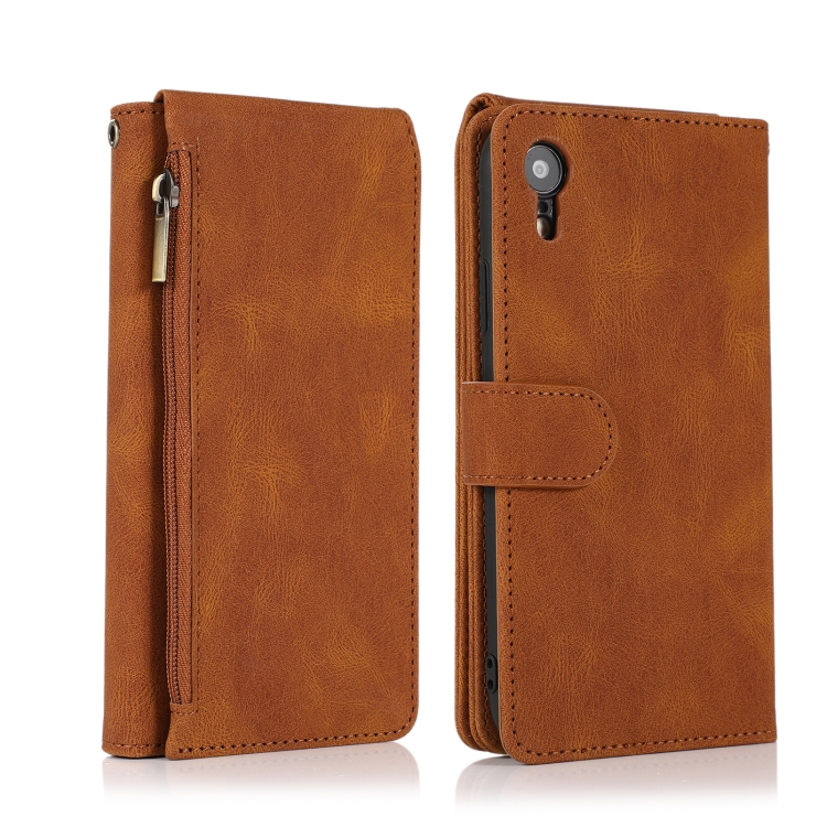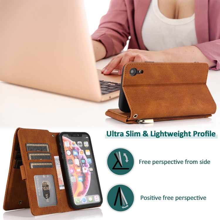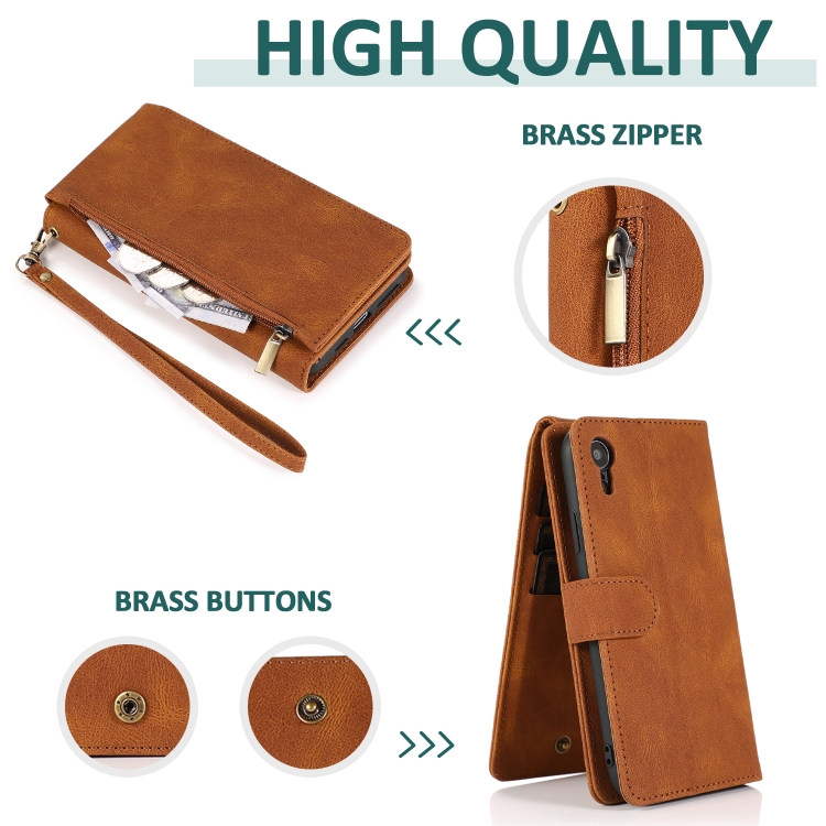 Estuche de Cuero para iPhone Xr Skin-Feel Crazy Horse Texture Zipper Wallet Bag con Tapa Horizontal, Soporte, Ranuras para Tarjetas y Cordón (Marrón)