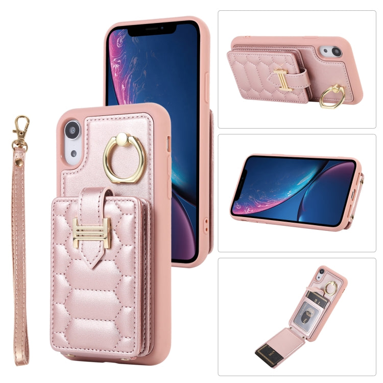 Funda para Teléfono iPhone Xr Vertical Card Bag Ring Holder con Doble Cordón (Oro Rosa)